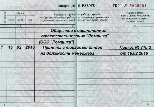 В момент оформления человека в компанию требуется вносить информацию в его трудовую книжку о факте трудоустройства. Образец заполнения трудовой книжки указывает на то, что должна быть ссылка на приказ, на основании которого принимается гражданин в фирму.