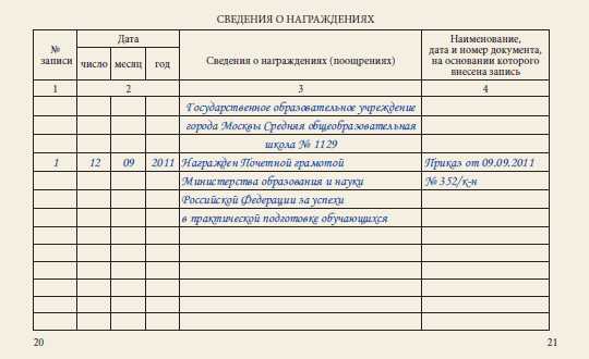 Пример заполнения трудовой книжки при получении награды приводится ниже.