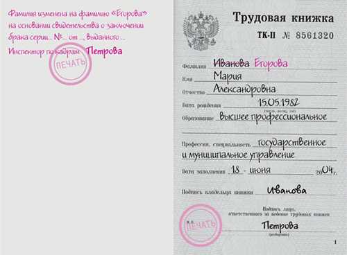 Пример внесения записи в трудовую книжку об изменении фамилии в связи со вступлением в брак
