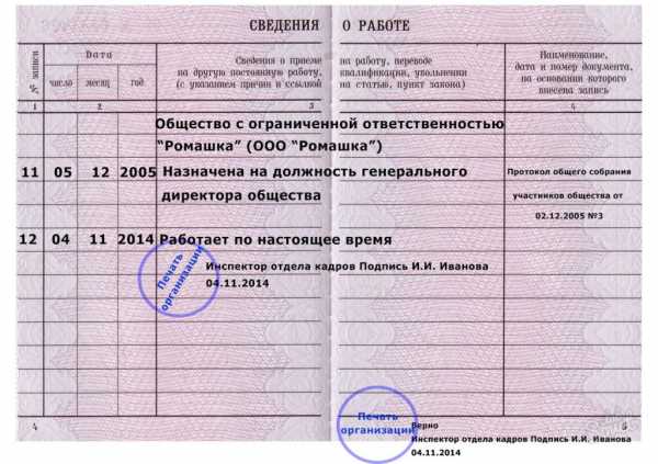 Пример внесения записи в трудовую книжку о назначении на должность руководителя общества с ограниченной ответственностью