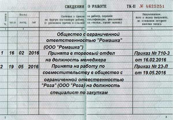 Пример внесения записи в трудовую книжку о работе по совместительству в предшествующий период