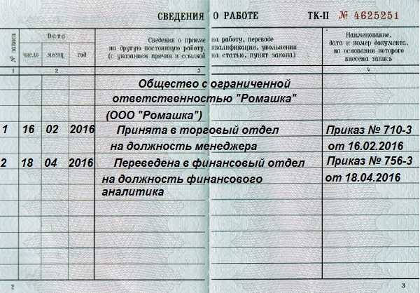 Бывает такое, что сотрудник переводится для дальнейшей работы в другой отдел или меняет должность. Естественно, такие перемены в его карьерном пути необходимо зафиксировать в трудовой.