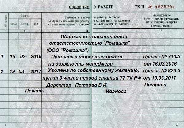 Пример внесения записи в трудовую книжку об увольнении руководителя организации