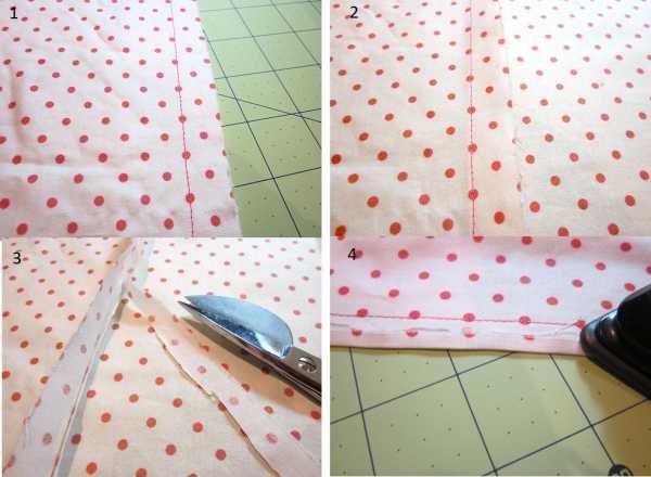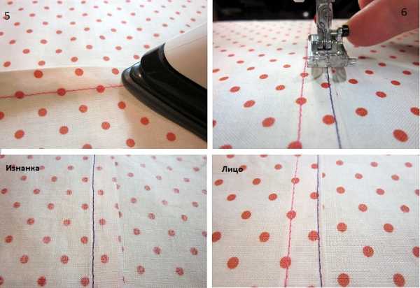 Как и в первом варианте, первая строчка прокладывается по лицевой стороне изделия. Затем следует разложить его и, если нужно, сделать подрезку одной из сторон. Длинная кромка подгибается примерно на 3 мм и заутюживается. Потом снова с помощью утюга нужно по шву пригладить срез (фото №5). Окончательная строчка прокладывается поверх изделия параллельно первой.