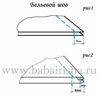 Этот шов чуть более сложный в выполнении. Но и выглядит он эстетичнее предыдущего. Шов получается плоским, что очень важно для белья. Срезы ткани также прячутся внутри, таким образом, они никогда не растреплются, а само изделие не расползется по шву.