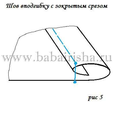 Если подгибка широкая, для удобства, можно наметить ширину подгибки. В таком случае сначала подгибают край изделия на размеченную ширину подгибки, а затем, направляя 1,0 см среза подгибки внутрь шва, закрепляют машинной строчкой (рис.5)