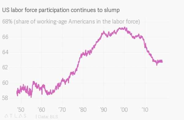 Сейчас лишь 62,7% американцев в этой группе имеют работу или активно пытаются ее найти. Это примерно то же самое, что и в конце 1970-х гг., до того как женщины массово пришли на рынок труда. И это не только потому, что рабочая сила Америки стареет.