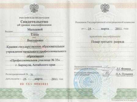 Документ о присвоении повару квалификации