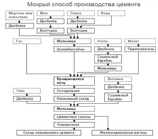 Известняк как более твердый материал предварительно подвергается дроблению, а пластичная глина измельчается в присутствии воды в специальных аппаратах (болтушках или мельницах-мешалках). Окончательное тонкое измельчение с получением однородной смеси известняка, глиняного шлама и корректирующих добавок происходит в шаровых трубных мельницах. Хотя компоненты дозируют в мельницы в заданном соотношении, из-за колебаний их химико-минералогических характеристик не удается получить в мельнице шлам состава, отвечающего установленным параметрам. Поэтому необходима специальная технологическая операция по корректировке его состава. После проверки соответствия состава шлама заданным показателям его подают на обжиг во вращающуюся печь, где завершаются химические реакции, приводящие к получению клинкера. Затем клинкер охлаждается в холодильнике и поступает на склад, где также хранятся гипс и активные минеральные добавки. Эти компоненты предварительно должны быть подготовлены к помолу. Активные минеральные добавки высушивают до влажности не более 1 %, гипс подвергают дроблению. Совместный тонкий размол клинкера, гипса и активных минеральных добавок в шаровых трубных мельницах обеспечивает получение цемента высокого качества. Из мельниц цемент поступает в склады силосного типа. Отгружают его либо навалом (в автомобильных и железнодорожных цементовозах), либо упакованным в многослойные бумажные мешки.