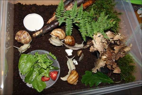 Высота террариума должна быть не менее 50 см. Для ухода вам нужно приобрести обычный ручной пульверизатор. Также позаботьтесь о емкостях, в которых будут находиться вода и еда. Жидкость должна быть всегда свежей. Нельзя допускать, чтобы вода в емкости заканчивалась. Улитки виноградные в домашних условиях растут неплохо. Для того чтобы им было по чему ползать, можете дополнительно декорировать емкость мхом или какими-либо деревянными корягами. На дне террариума должен находиться специальный субстрат или кокосовый наполнитель. Его толщина не должна быть большой (около 5 см).